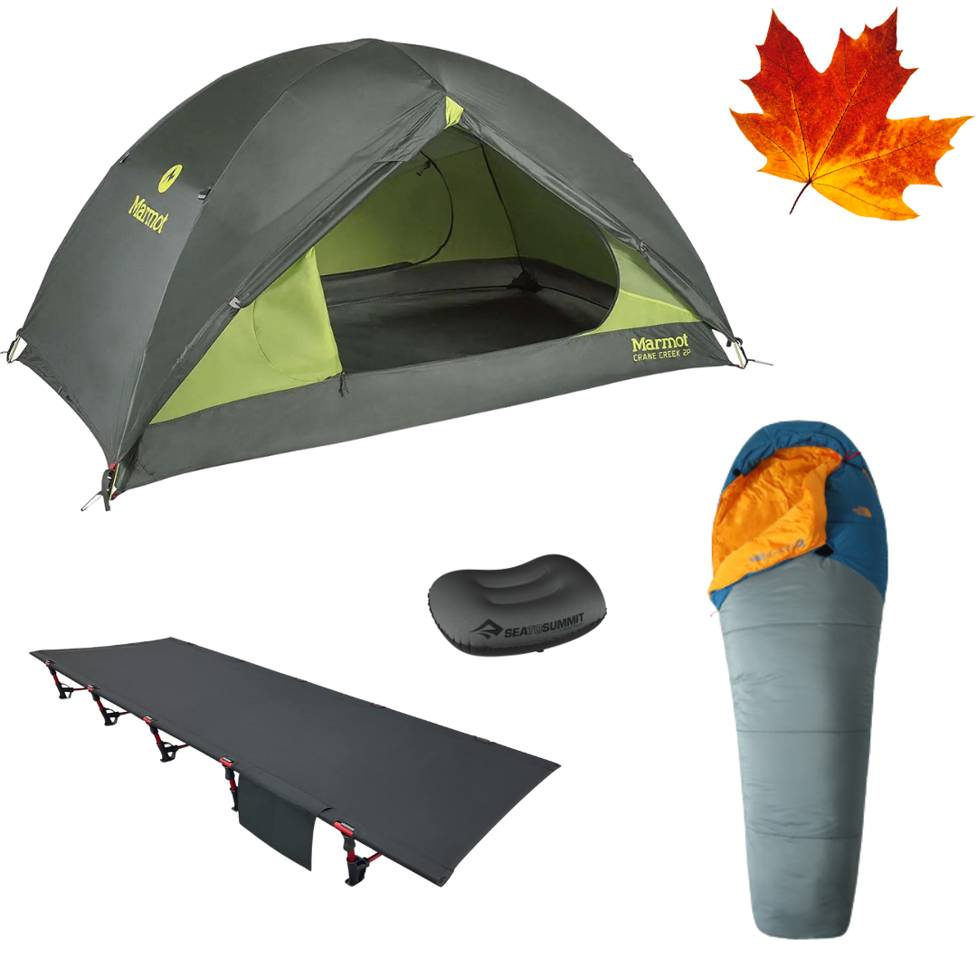 This package is a great choice if you’re tagging along with friends or family who already have the cooking gear. You’ll have your own warm and comfortable sleeping setup while sharing meals and cookware with your group. (If you want the full package, check our Complete Fall Camping Package for One).
